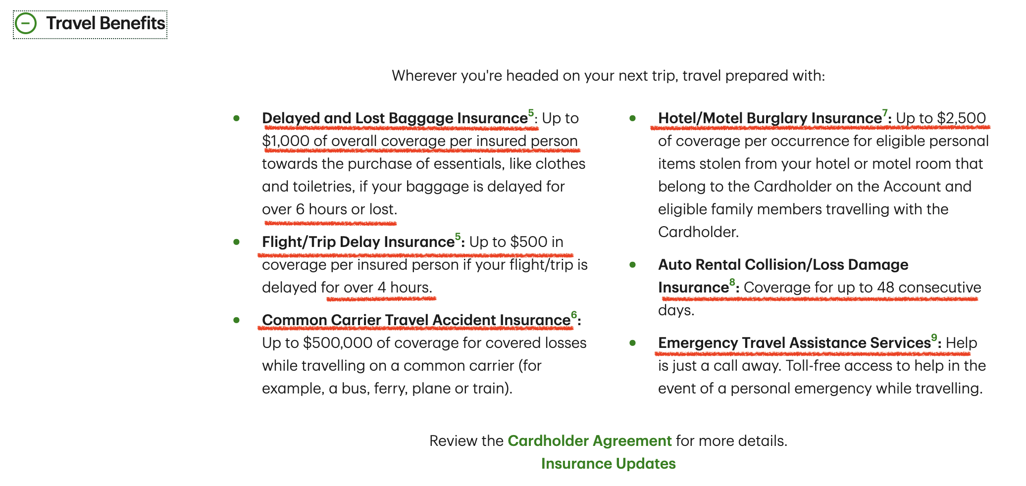 대중교통이나 비행편 등등의 사고로 인한 커버도 50만불이나 있고, 숙소에서 짐 도둑맞으면 나와 동행한 가족까지 합쳐서 $2,500까지 커버된다. 물론 가족들의 숙박비용도 이 카드로 지급해야한다.