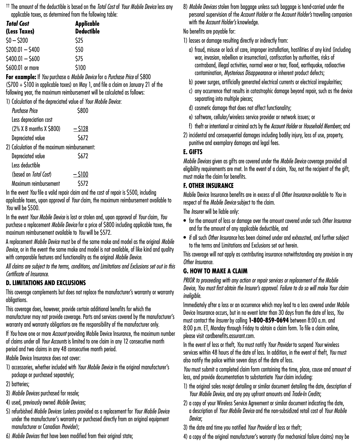 다.만!!! 매달 쓸때마다 감가상각이라고 하여 핸드폰의 가치가 2%씩 줄어 든다. 그러니 1000불에 샀어도 다음달에 잃어버려서 클레임 한다면 2% 가치 줄어든것(20$)을 빼고 기타 디덕션을 빼면 880$를 받을 수 있는것!!!